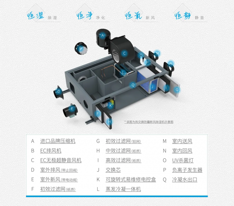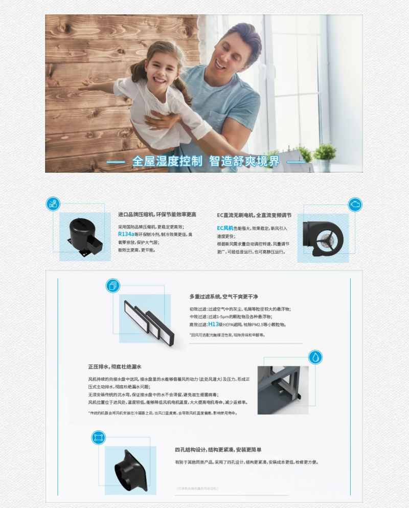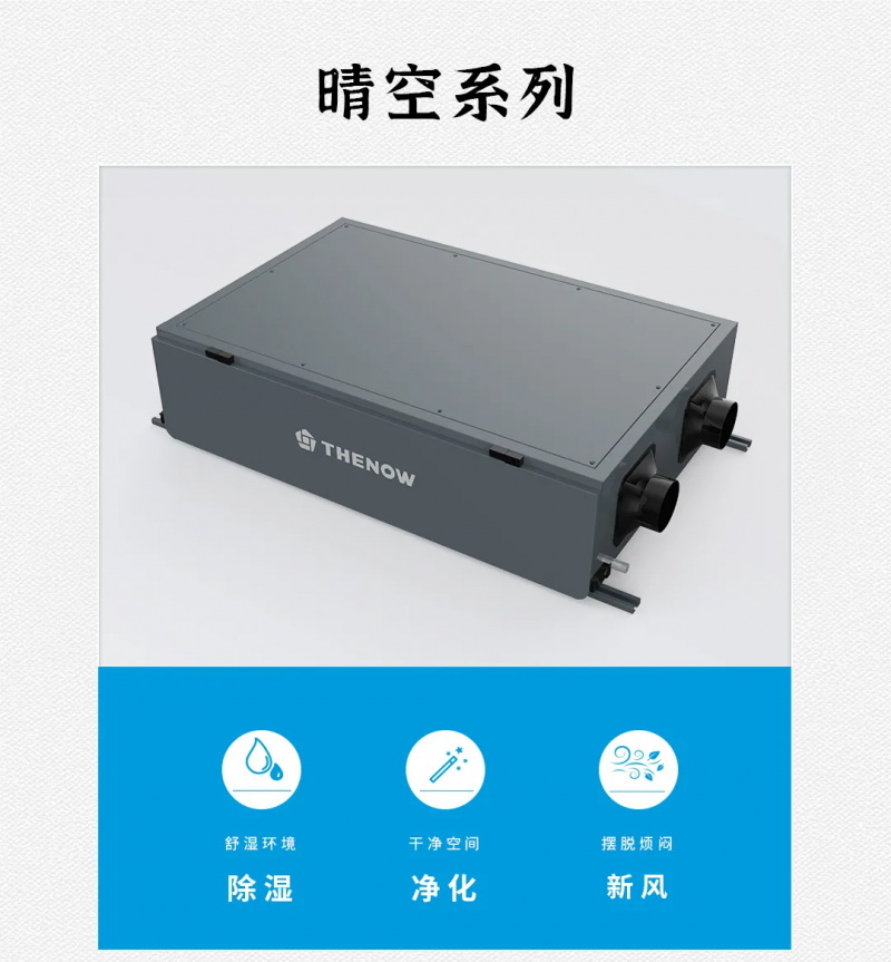 晴空系列包含管道式除濕機、單向流防霾新風除濕機、雙向流防霾新風除濕機、雙冷源全熱交換防霾新風除濕機四種產品,既能滿足單純除濕用戶的需求,也能滿足各類需要通風換氣且需要除濕的用戶需求,實現全方位呵護呼吸健康,讓你暢享舒適干爽的新鮮空氣。
