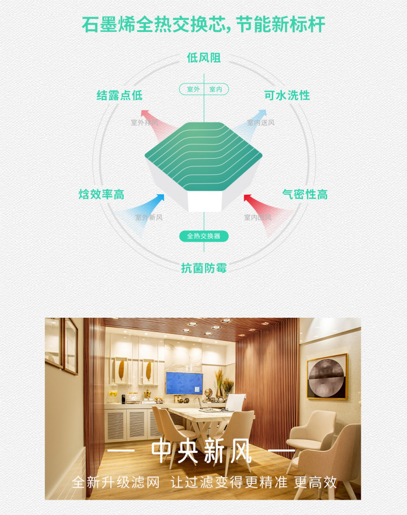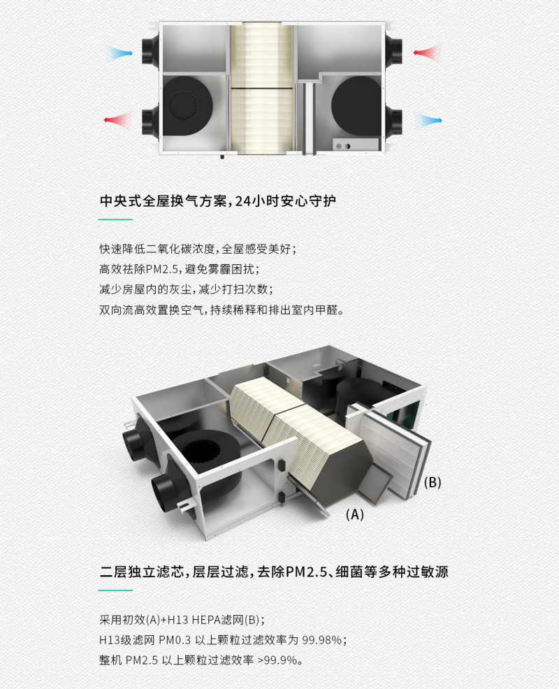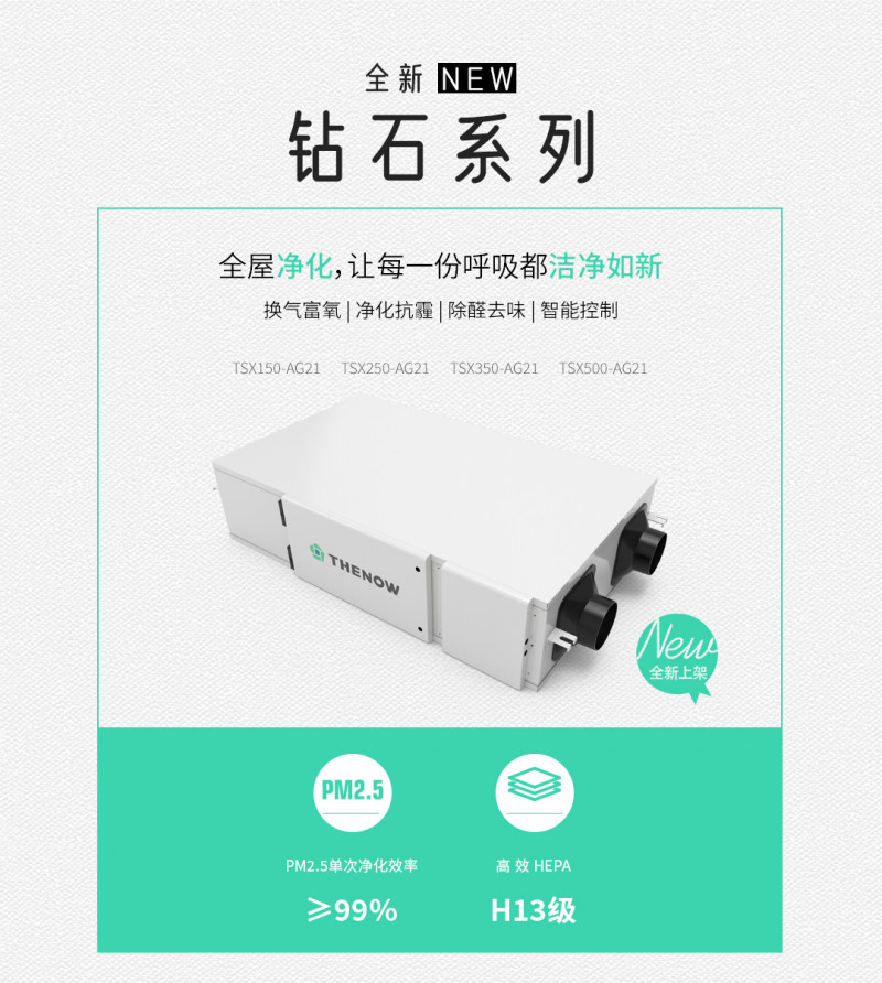 鉆石系列采用初效、中效、H13級HEPA過濾系統(tǒng),集成通風(fēng)換氣、全熱交換、恒溫恒濕、祛霾補(bǔ)氧為一體,為用戶提供新鮮有氧潔凈舒適的空氣環(huán)境。