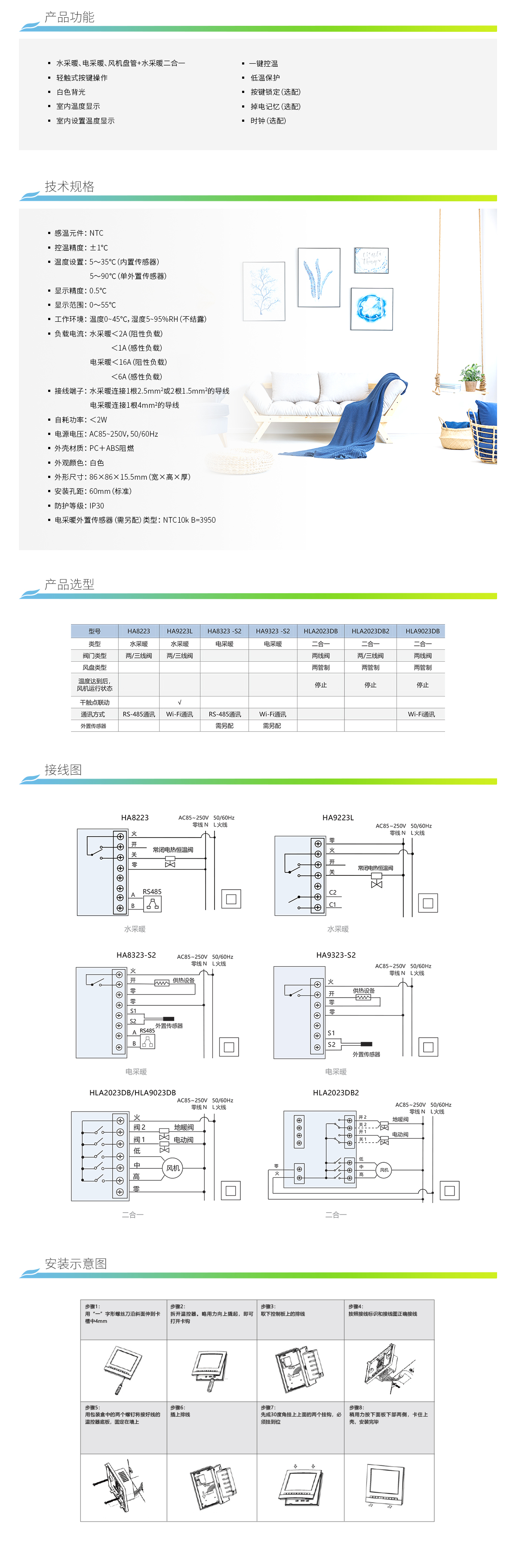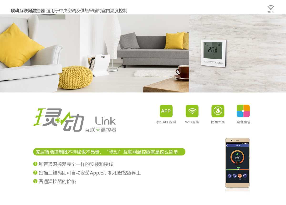 ?動溫控器適用于家庭地板采暖系統或散熱器采暖系統的室內溫度控制。一體化弧形表面設計簡潔流暢,多彩定制搭配滿足家居裝飾選擇需求,進口材質、安全耐候性強,網絡連接安裝簡單、操作便捷,感知靈敏、控制精準。
