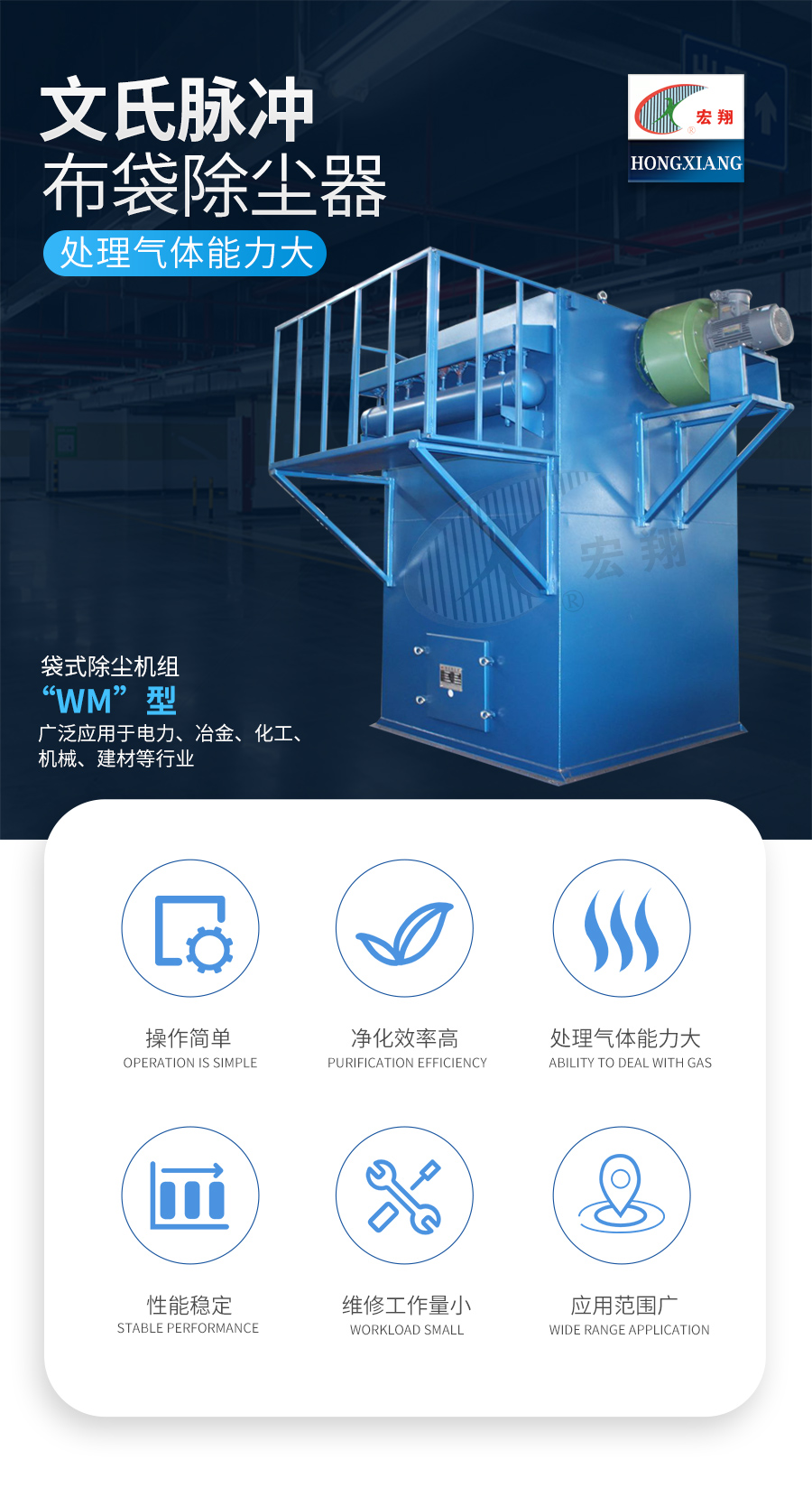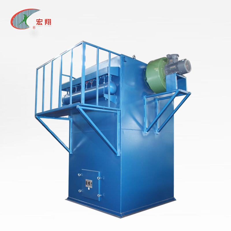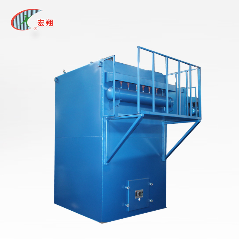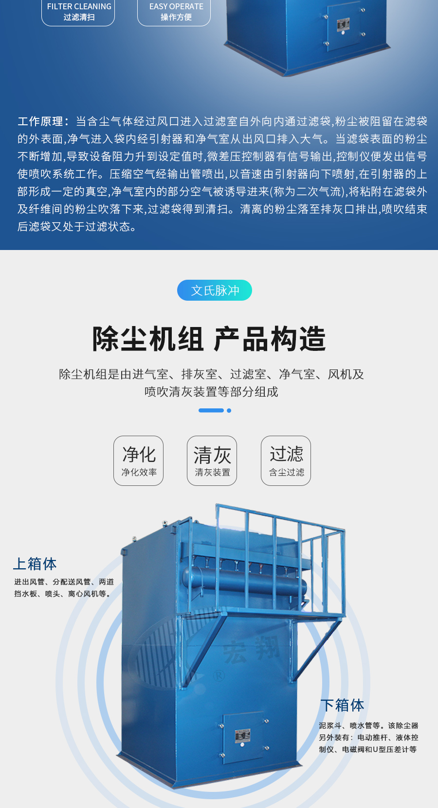 本除塵機組由進氣室、排灰室、過濾室、凈氣室、風機及噴吹清灰裝置等部分組成。 本除塵機組工作原理為:當含塵氣體經過風口進入過濾室自外向內通過濾袋,粉塵被阻留在濾袋的外表面,凈氣進入袋內經引射器和凈氣室從出風口排入大氣。當濾袋表面的粉塵不斷增加,導致設備阻力升到設定值時,微差壓控制器有信號輸出,控制儀便發出信號使噴吹系統工作。壓縮空氣經輸出管噴出,以音速由引射器向下噴射,在引射器的上部形成一定的真空,凈氣室內的部分空氣被誘導進來(稱為二次氣流),將粘附在濾袋外及纖維間的粉塵吹落下來,過濾袋得到清掃。清離的粉塵落至排灰口排出,噴吹結束后濾袋又處于過濾狀態。