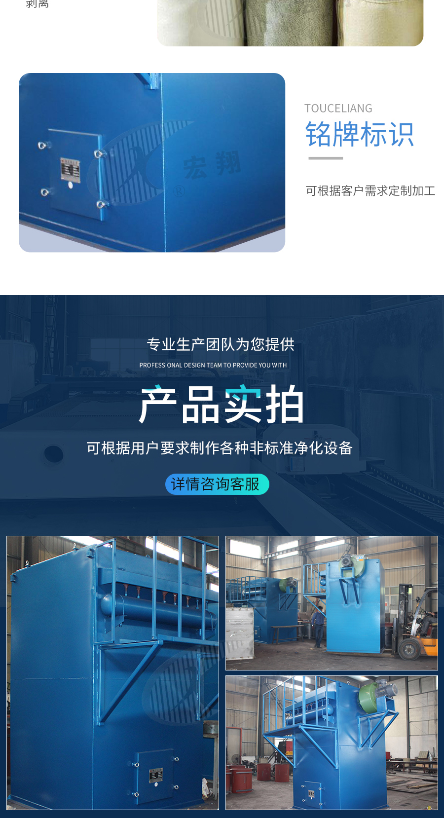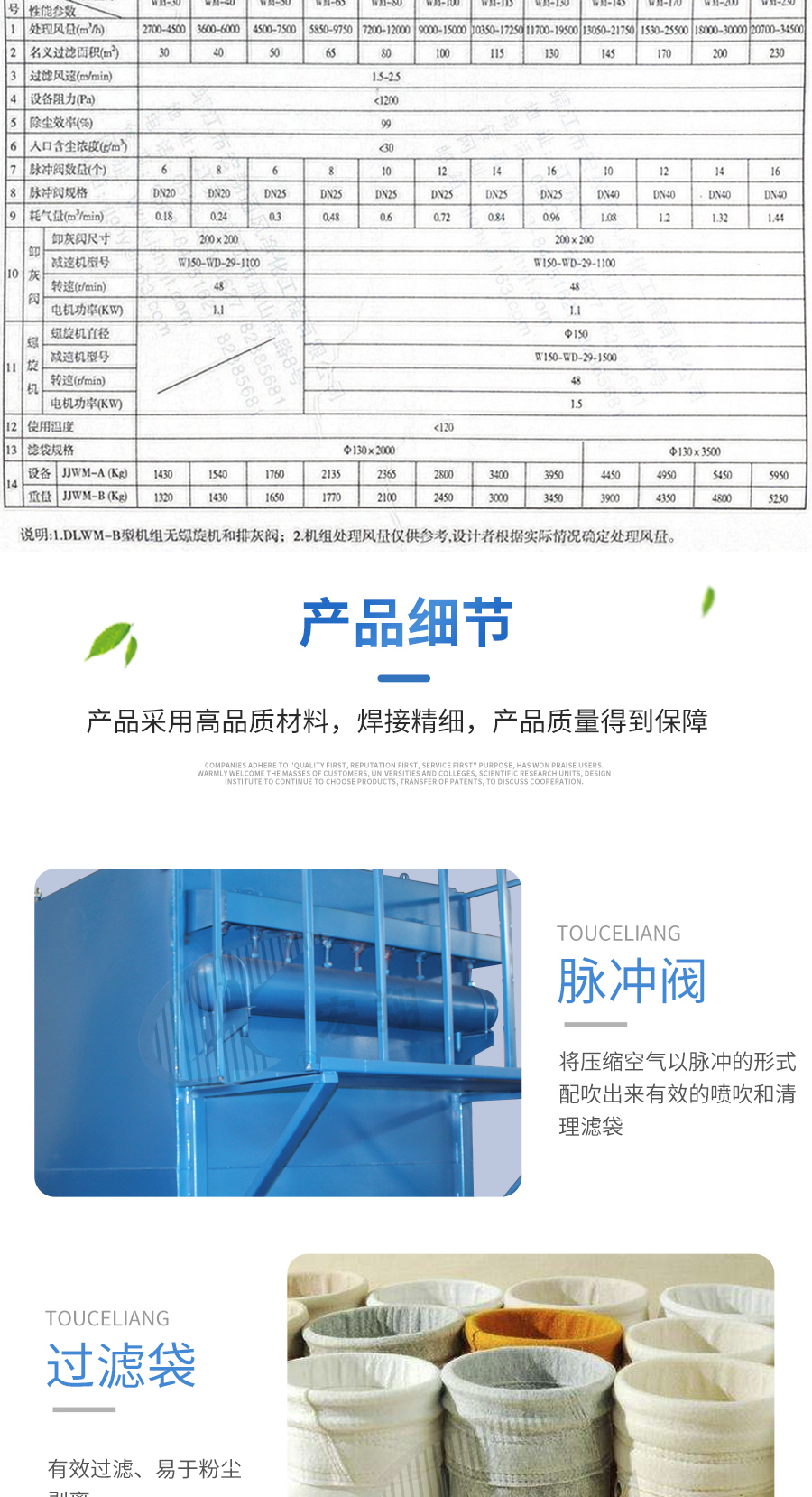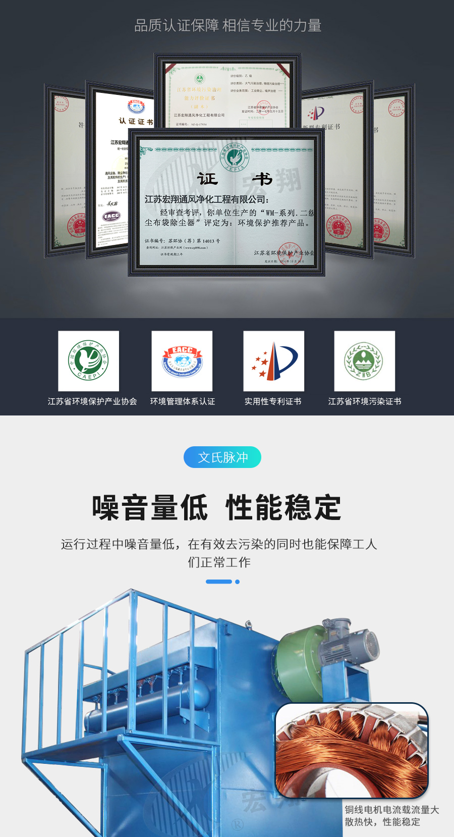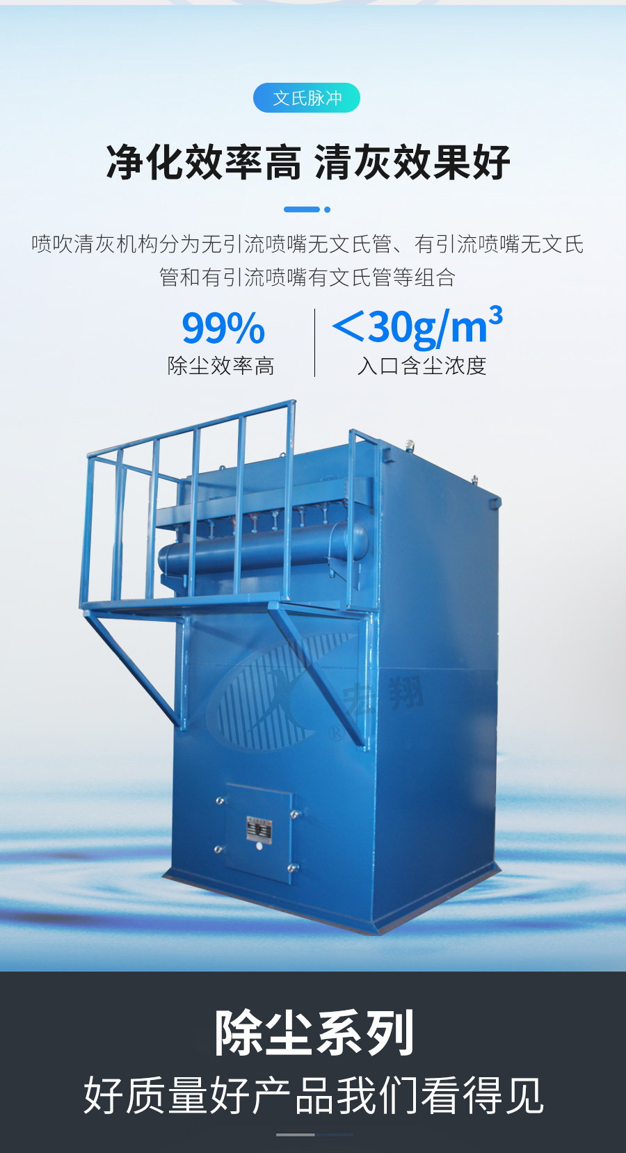 本除塵機組由進氣室、排灰室、過濾室、凈氣室、風機及噴吹清灰裝置等部分組成。 本除塵機組工作原理為:當含塵氣體經過風口進入過濾室自外向內通過濾袋,粉塵被阻留在濾袋的外表面,凈氣進入袋內經引射器和凈氣室從出風口排入大氣。當濾袋表面的粉塵不斷增加,導致設備阻力升到設定值時,微差壓控制器有信號輸出,控制儀便發出信號使噴吹系統工作。壓縮空氣經輸出管噴出,以音速由引射器向下噴射,在引射器的上部形成一定的真空,凈氣室內的部分空氣被誘導進來(稱為二次氣流),將粘附在濾袋外及纖維間的粉塵吹落下來,過濾袋得到清掃。清離的粉塵落至排灰口排出,噴吹結束后濾袋又處于過濾狀態。