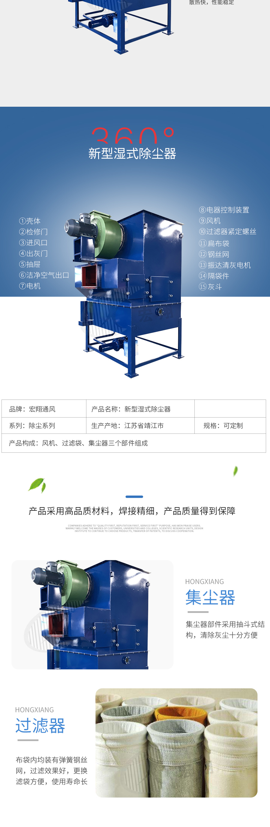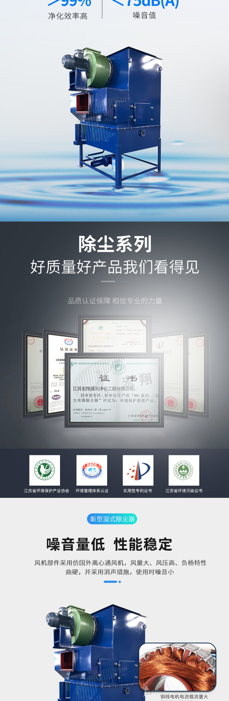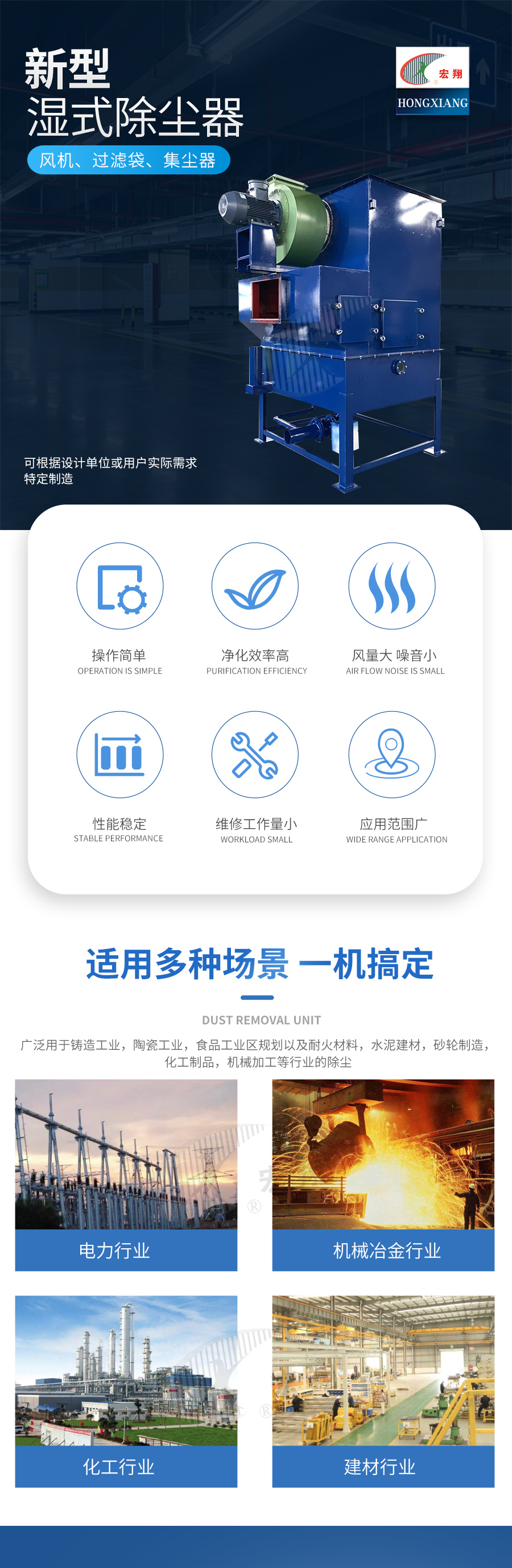新型濕式除塵器是利用洗滌液(一般為水)與含塵氣體充分接觸,將塵粒洗滌下來而使氣體凈化的方法。在循環噴淋系統中裝置高壓噴嘴和高效填充材料,使噴液能達到霧化狀態,當噴淋水和含塵氣體接觸時,氣體中的可吸收粉塵溶解于液體中,會形成氣體、固體混合液體。但由于塔內設置了固液分離器,大部分大顆粒的固體顆粒被收集,噴淋水又重新循環。隨著時間的延長及溶液中吸收質濃度不斷增大,吸收速度會不斷減慢。因此,在此時要更換噴淋液體,使含塵廢氣與新鮮的噴淋液結合,更有利于含塵廢氣的吸收,達到想要的處理效果。