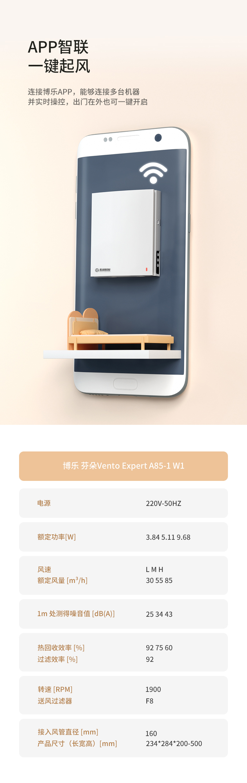 壁掛式新風系統(tǒng) Vento Expert A85(芬朵系列) 優(yōu)勢:恒溫恒氧、高效除霾、靜音舒適、A+節(jié)能認證、APP智能控制、防風防雨、無級調(diào)速、簡致外觀。 應用場景 已裝修房屋 單個房間 辦公室 咖啡廳 會議室 適用面積10-20m2 相關(guān)下載 購買方式 產(chǎn)品參數(shù)