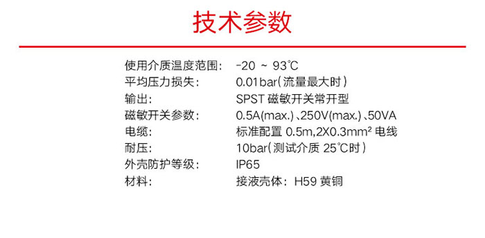 工作原理簡單、直觀、可靠,由于黃銅流量開關內部只有一個移動部件。故其工作狀態(tài)穩(wěn)定。元件無磨損且性能穩(wěn)定。產(chǎn)品采用高精度、低壓降及長壽命設計。自來水或油中使用,無需過濾器。