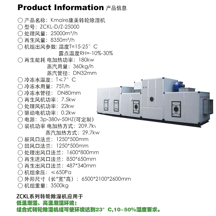 ZCKL系列轉輪除·濕空調機組系與冷凍除·濕精準匹配組合而成。通過對機組處理進風降溫減濕,再經轉輪深層次除·濕后,其處理空氣含濕量達到設計要求,再經過后級表冷降溫到設計溫度值,使機組出風溫度、相對濕度均能符合用戶要求,達到常溫低濕的除·濕結果。
