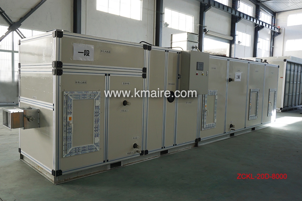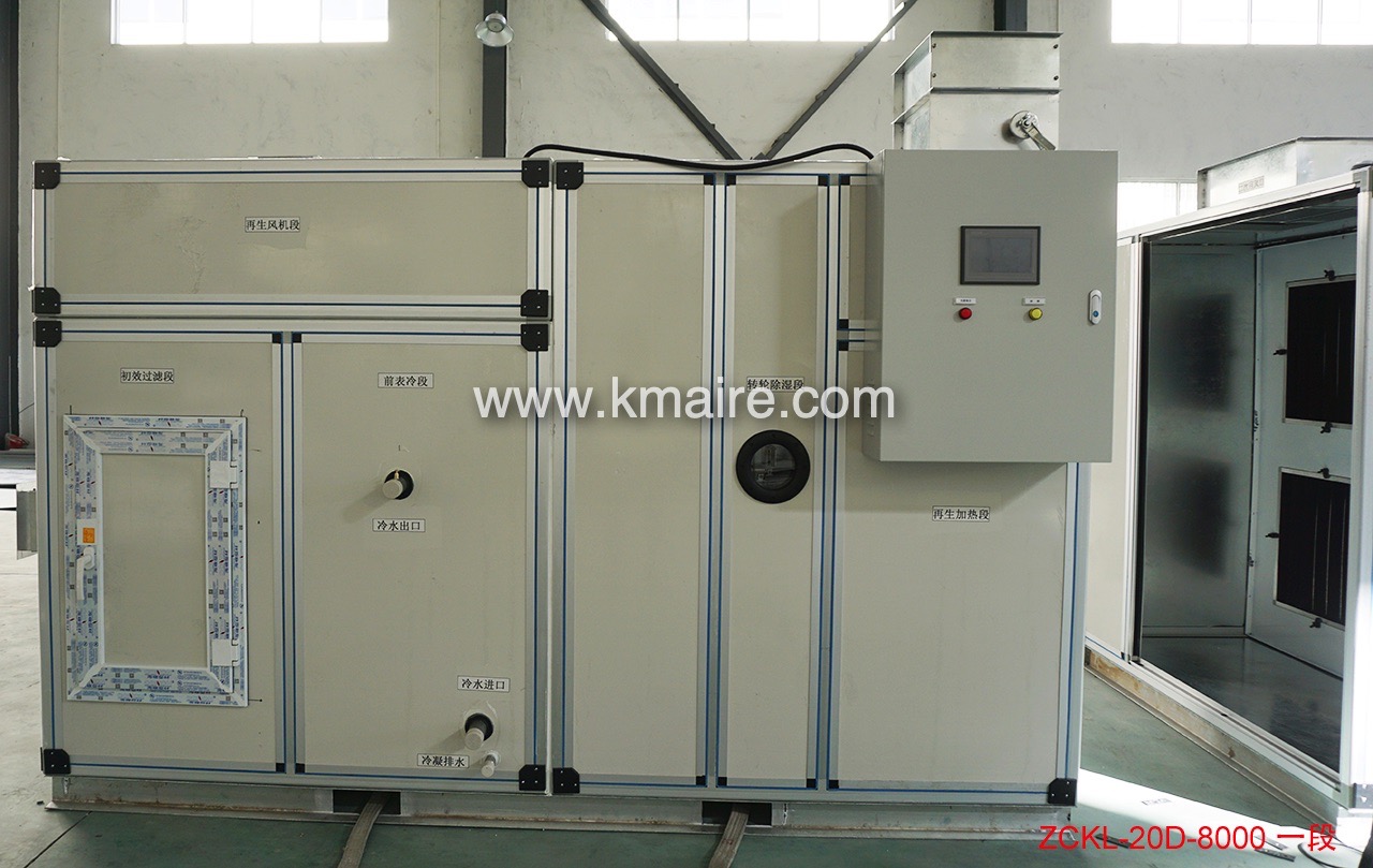 1、ZCKD低露點轉輪除濕機組主要由初效過濾段、新風表冷段、回風段、混合表冷段、超級硅膠或分子篩轉輪除濕段、冷吹再生區、后表冷段、中效過濾段、均流段、送風段和PLC電氣控制系統組成;