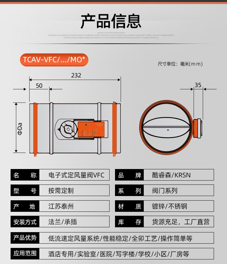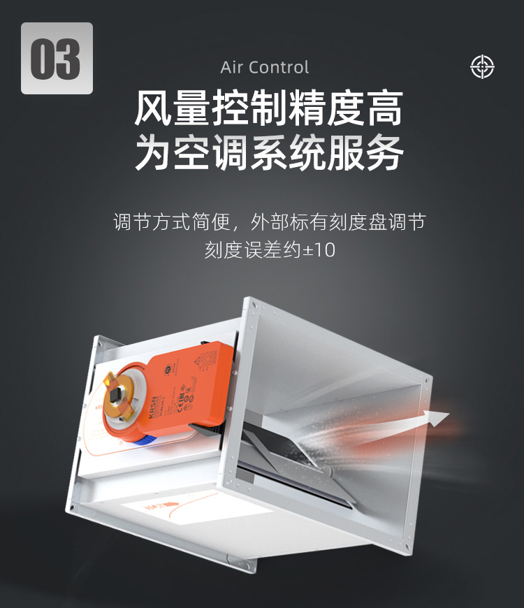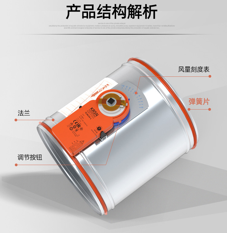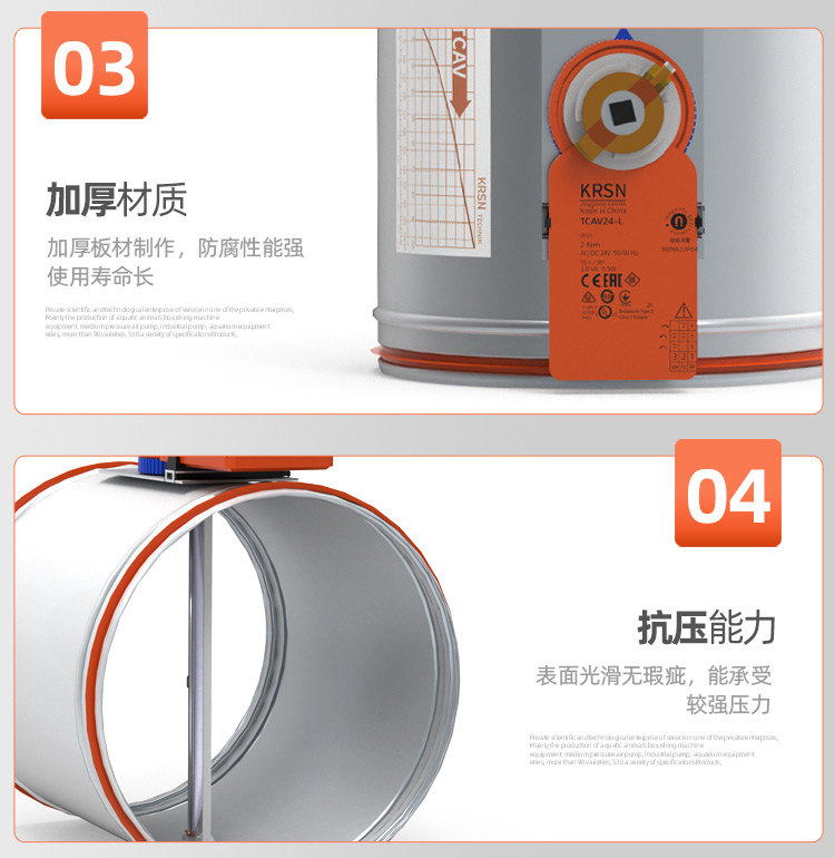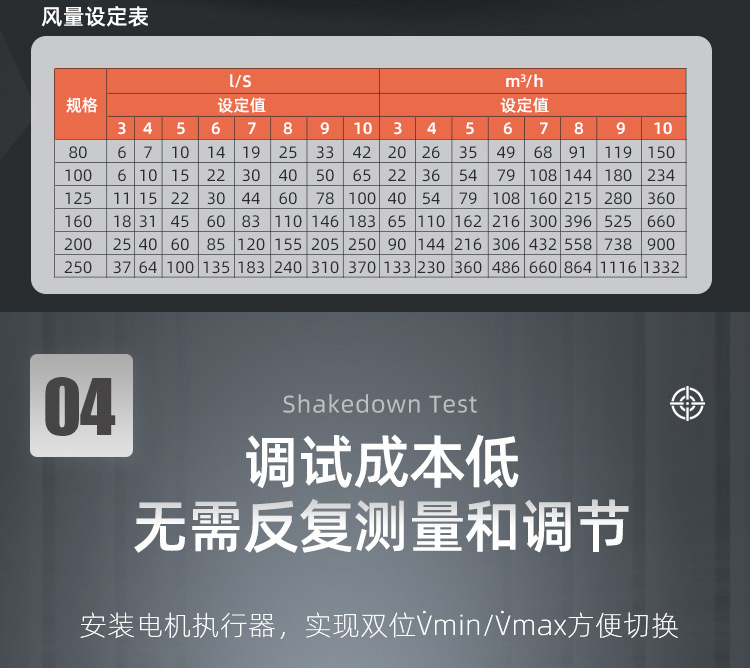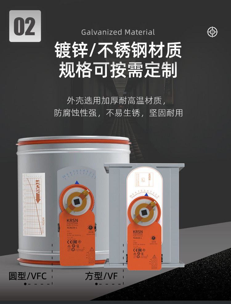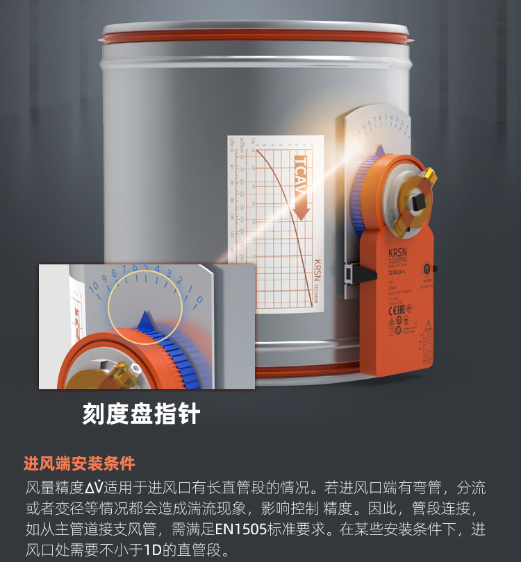TCAV-VFC:圓形機械電動式風量調節器,用于低流速定風量系統,適用于送風或排風 ,適用于風速低至0.8m/s ,調試便捷 ,可使用圓形旋鈕及刻度盤來設置所需風量 ,適用于改造項目中安裝執行器來自動控制風量 ,免維護設計 ,閥體漏風量符合出廠標準 ,可選配置及附件 ,閥體兩端插接口帶氟橡膠密封圈 ,用于連續風量調節或Vmin / Vmax雙位風量切換的執行器